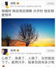 但很快的,在10年杨幂和胡歌双双发微博暗示两人已经分手,当时杨幂微博上都是一些伤感的东西~