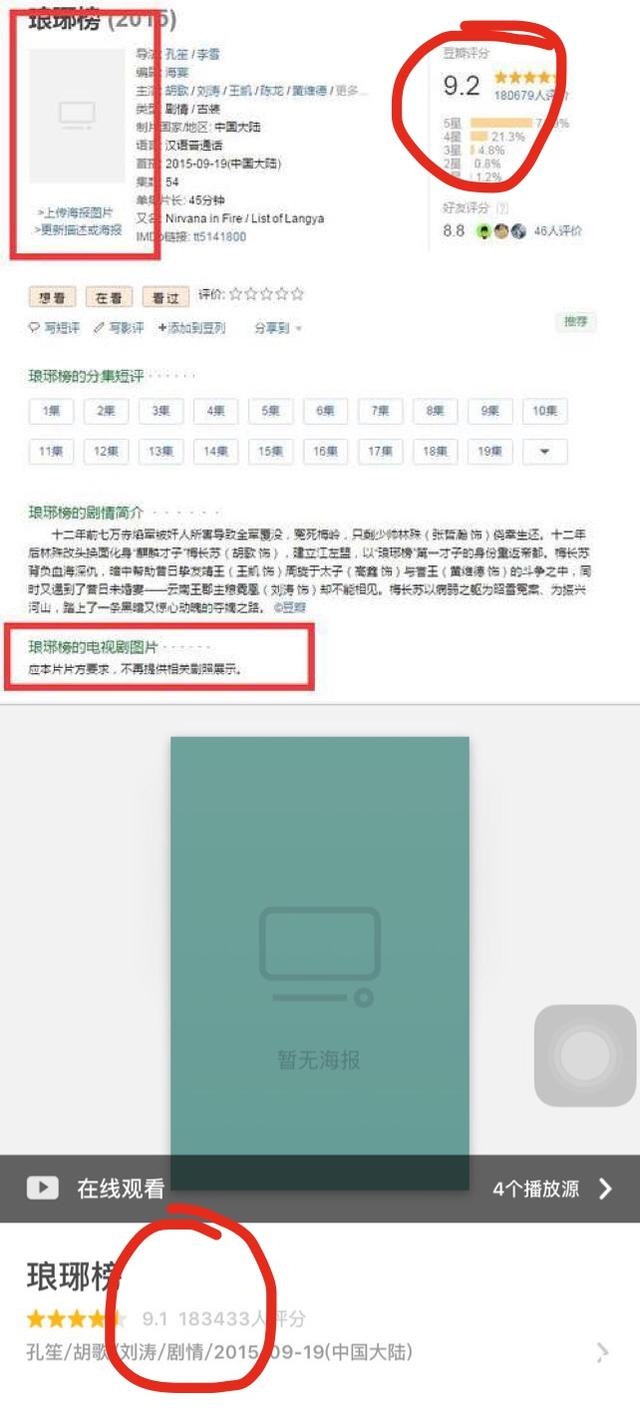目前,豆瓣上面的《琅琊榜》的剧照等都被删除了,不仅如此,之前本是9.2的评分在逐步往下降,一夜之间就被刷掉了0.1分