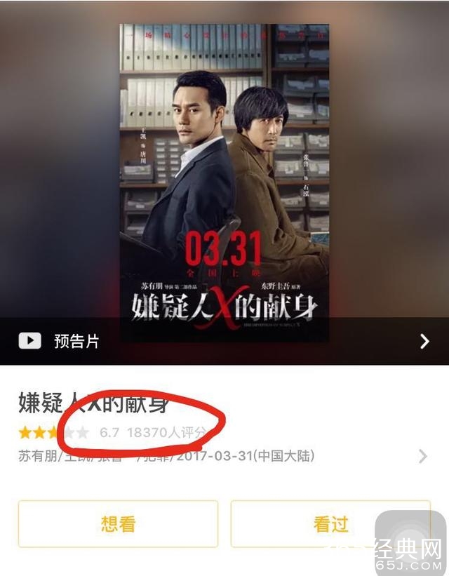 最近刚刚上映的电影《嫌疑人X的替身》也只拿了6.7分的分数