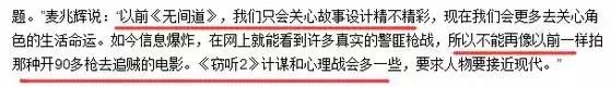 “以前拍《无间道》,我们只关心故事精彩不精彩……如今信息爆炸,在网上就能看到许多真实的警匪枪战,所以不能再像以前一样,拍那种开90多枪去追贼的电影了。”