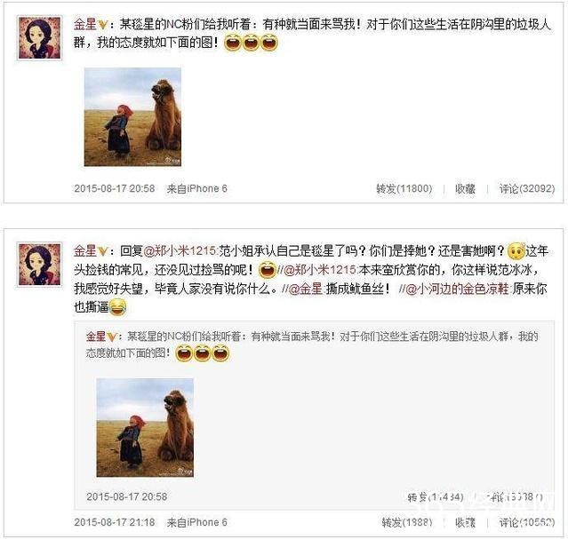 蹭蹭热度也就够了,这种伤人的话也乱说。粉丝们看见偶像被骂,也不甘示弱就对金星开炮。金星也不是好欺负的人,发微博手撕冰冰粉丝,一点都不手软。
