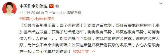 然而,刘信达却在微博发微博进行恶评,刘信达写道:“狗狗很有气势,郑爽也很有气势,可谓狗仗人势,人狗合一。”“希望郑爽告别复杂的娱乐圈,安心安意跟狗在一起,当个简单的训狗师!”