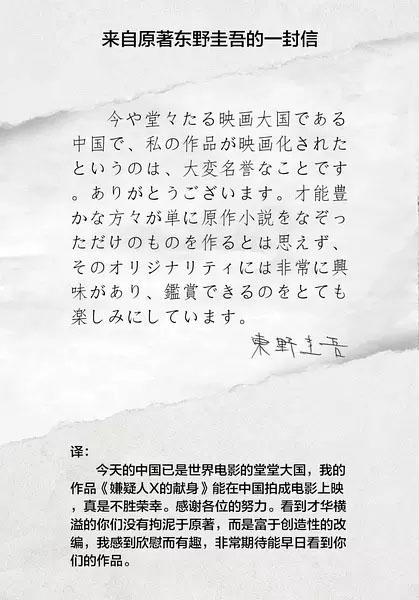 苏有朋导演的《嫌疑人x的献身》上映前,东野圭吾大神发来了一封公开信: