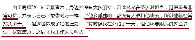 林允说,觉得周星驰非常可怜,很孤独,没有人敢和他聊天,所以周星驰只好找她聊天。