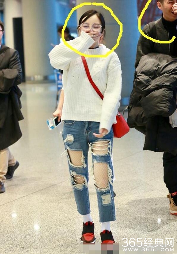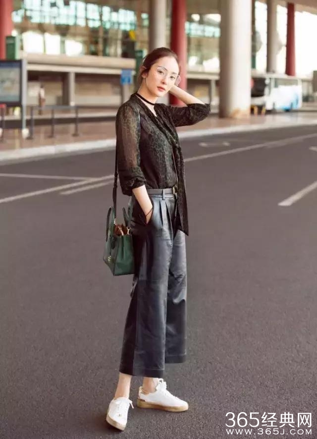一身潮装酷似杨幂,透明眼镜、渔网牛仔裤、脖子上的颈圈都是杨幂同款。杨幂这身黑色半透视的上衣加上同样黑色的九分阔腿皮裤,时尚感十足,叫上的小白鞋又是减龄必备,这样一身的装扮站在机场外面又是该有不少的回头率吧~