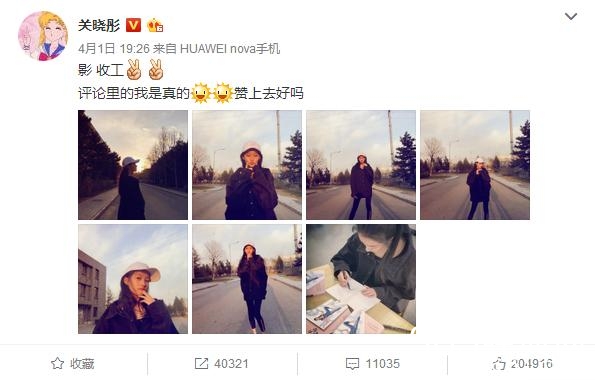 “国民闺女”关晓彤最近在微博上晒了一组自己收工后的自拍
