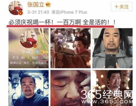 这是什么意思呢?网友们仔细一看,才知道原来张国立老师是在庆祝微博粉丝过百万,是的,你明天看错,张国立只有一百万粉丝,是不是不太相信,注意张国立老师的话,全是活的。
