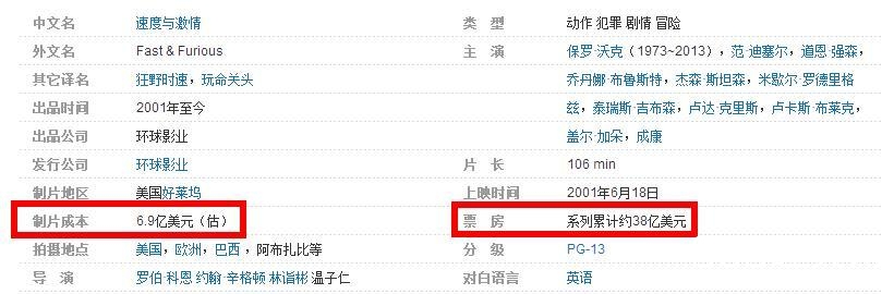 百度百科电影《速度与激情》词条下,七部《速度与激情》的制片成本仅有6.9亿美元,比影君子查到的数据更少。但无论是哪个数据,拍摄造成的物品损失高达5.14亿美元的说法都不靠谱。