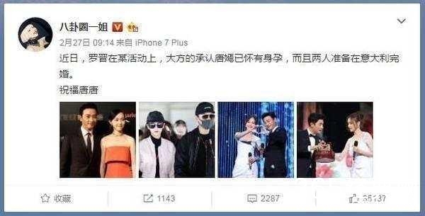 然而就在前几天,有个微 博 加V用户爆料称:35岁罗晋在 某活动上,大方的默认唐嫣已怀孕,并且两人 将于意大利选择完婚!相信粉丝们看到这应该炒鸡激动吧,并且 也很期 待这一刻的到来吧?