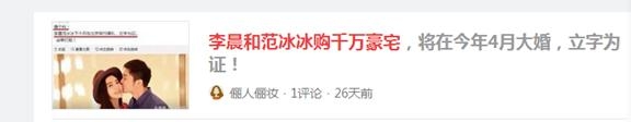 2015年5月, 李晨在微博公开了和范冰冰两人恋情,而范冰冰转发,这也是范爷第一次公开自己的男友,在这之后,不断传出各种新闻,有人催瞎时候结婚,当然也要有不少绯闻