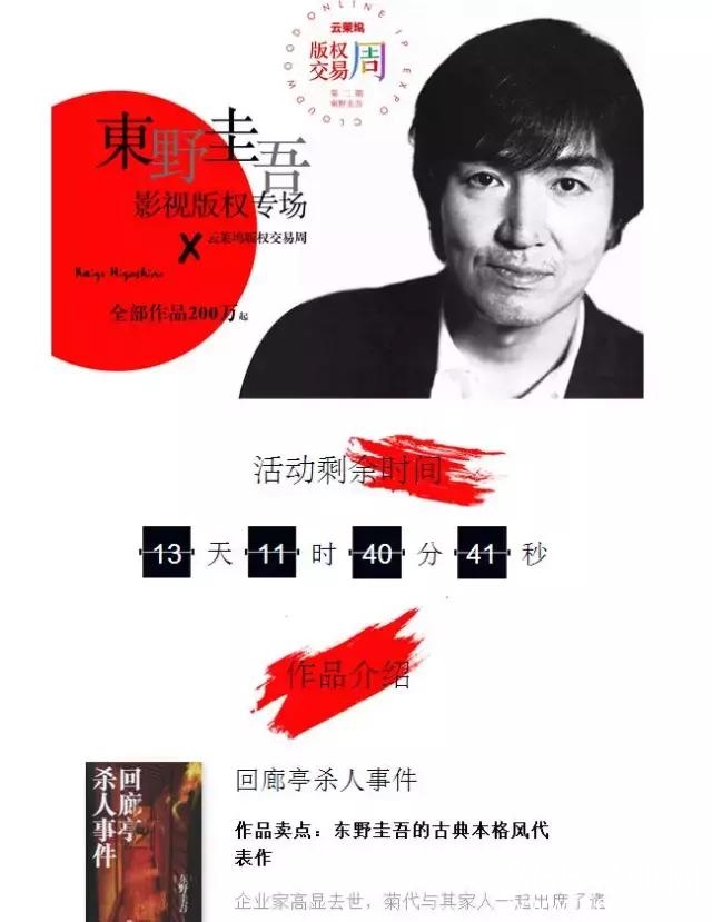 最近,版权交易平台云莱坞上线了“版权交易周·东野圭吾影视版权专场”,包括《回廊亭杀人事件》《布鲁特斯的心脏》《布谷鸟的蛋是谁的》等10部东野圭吾的作品在列其中,每部作品的影视版权售价200万起。