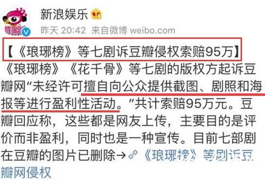 新闻里是这样说的——根据北京市朝阳区知识产权服务平台的消息,《渴望》、《编辑部的故事》、《花千骨》、《北平无战事》、《琅琊榜》、《雾里看花》、《产科医生》等七部作品的版权方联名把豆瓣告上了法庭,理由是豆瓣电影「利用截图、剧照和海报进行盈利活动」构成侵权,并向其索赔95万元的赔偿金。