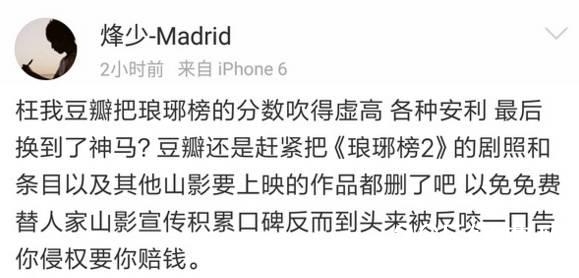 @知乎匿名用户:我很怀疑这事儿是不是跟上次某电影怼豆瓣打分的事儿有关。那次他们偷鸡不成蚀把米,啥也没捞着,还被广大群众骂了。他们回去想来想去,搭上了山影某个领导,双方一拍即合沆瀣一气,继续找豆瓣麻烦。这次他们要是成功了,豆瓣电影岂不是全部要撤剧照?豆瓣电影还搞不搞了?非常阴损。控制不了豆瓣打分就要灭了豆瓣电影。极其之恶心。