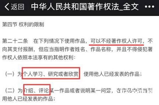 对此,小编专门查阅了著作法,发现法律条文里明确规定:著作权的使用是有限制的,如果是为了欣赏、介绍和评论而引用作品,则不构成侵权。