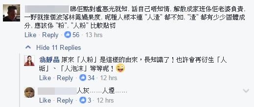 网友称“看他怎么对卢惠光就知道,说自己不知情……“渣”都有点固体成分,应该是“粉”,“人粉”比较贴切。“翁静晶则回:“原来“人粉”是这样的由来,才知道会了!”