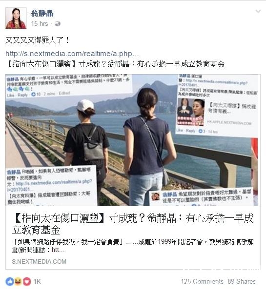 翁静晶代好友解释:“说到『主副责任』的问题,女方默默面对现实18年,男方完全地没有承担,甚至孩子有困难也不帮助,是违反人伦的做法。女的已经承搬主要责任,男方连次要责任也不肯负担。”
