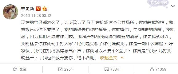 原来在不久之前,这个记者也曾经在机场为难过林更新,在林更新离开之后,那位记者还打了林更新的粉丝。林更新知道之后,也在微博痛骂了这个记者,还维护粉丝的说了一句话:“你真是当我面儿打我粉丝一下,我也会放开揍你,绝不模糊”!顿时觉得林更新好仗义!