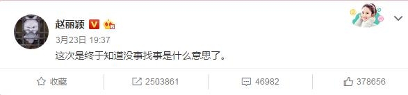 之后赵丽颖针对此事发布微博,言语之间还满是不悦,她说:“这次是终于晓得没事找事是什麼意思了”。