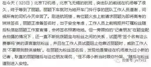 由于机场的人太多了,丽颖身边的保安为了安全着想,就上前委婉拒绝那位粉丝,并且抚慰她随后会将签名照寄给她。但是,突然就有个记者冒出来挑事!