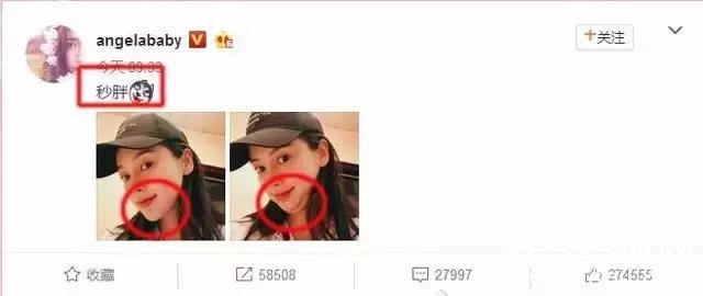 Baby的微博内容只有俩字,“秒胖”,因为配图已经很明显了。一张是baby正常的照片,另一张则是baby挤出下巴的照片,真的是“秒胖”。