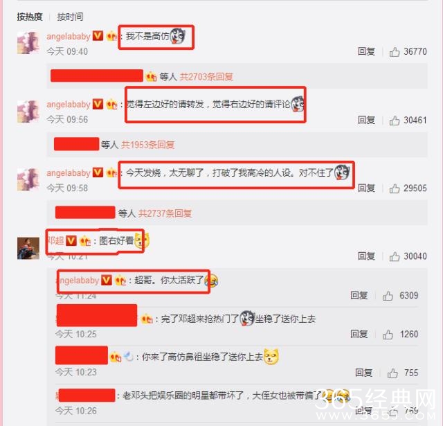 看来,为了不让高仿号占领baby的留言区,baby自己,也是豁出去了。是的,为了不让高仿号占据评论区,最好的办法,就是自己先占领。而baby也做到了,她的三条评论,果然是最热门的三条。