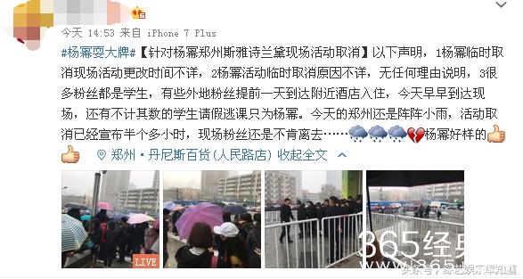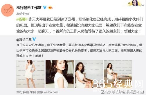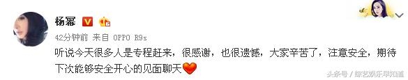活动临时取消之后,主办方马上发微博致歉:一方面感谢杨幂的到来,一方面跟大家解释原因,希望粉丝们可以理解。随后杨幂也在微博表示遗憾:听说今天很多人专程赶来,很感谢,也很遗憾,大家辛苦了,期待下次见面!