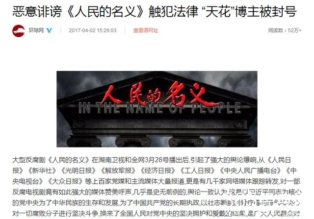 4月2日,环球网转载一篇名为《恶意诽谤《人民的名义》触犯法律“天花”博主被封号》的无署名文章。