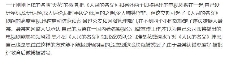 该文章提到某微博博主聂某承认自己的表弟在一国内著名影视公司做宣传工作,本以为自己公司即将播出的电视剧能够独领风骚,想不到《人民的名义》如此受欢迎,公司准备花钱请水军对《人民的名义》抹黑,自己也是想试试这样的方式能不能起到预期目的。