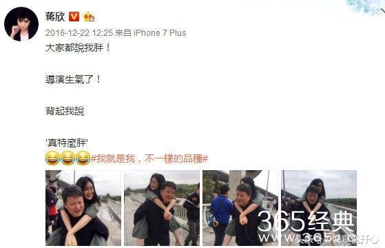 体重永远是一个女人的秘密,但是对于女明星来说就未必了,蒋欣的丰满是大家有目共睹的,早前蒋欣还晒图说:“导演嫌我太胖了,要亲自试试我到底有多重”,看着导演背起蒋欣的照片,真是替蒋欣捏了一把汗