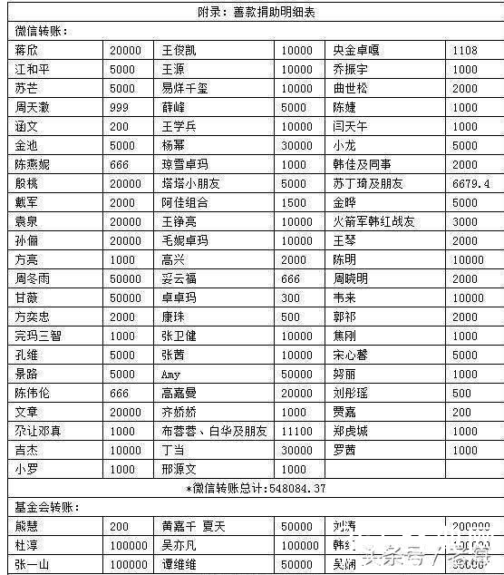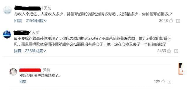在这份明细中我们可以很清楚的看到,每一个明细捐款的金额,其中亮点最大的就是孙俪,孙俪现在这么说也算是一线女演员了吧!而且每次接戏的片酬都是都是非常的高,但在这次捐款孙俪就只捐了2万,网上立即炸开锅了!说孙俪和邓超赚那么多钱就捐这么点儿。