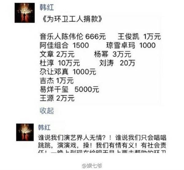 然后很快的韩红就在微博上公布了所有参加了捐款的名单捐款明细,这微博一发出韩红不在被骂,算是逃过一劫,但却连累了无辜的孙俪。