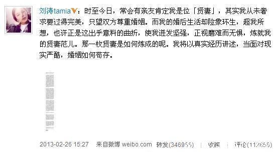 2016年1月3日,演员刘涛丈夫王珂在微博上发布了一篇名为《I’m back》的长文,文章细数了自己和刘涛相处的点点滴滴,并直言赞美妻子坚强执着、演技高超,甚至调侃自己就是“吃软饭的”,声称:“能娶到如此女侠,任人如何评价,我都是一辈子偷着乐吧。