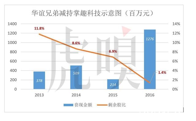 截至2016年末,华谊兄弟累计持减掌趣科技20次,合共套现23.77亿元。其中2016年套现12.76亿,确认“投资收益”7.45亿,相当于2016财年净利润的92.2%!