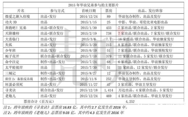 在《2015年度报告》中,华谊兄弟提到的影片有13部之多:《微爱之渐入佳境》、《功夫3D》、《奔跑吧兄弟》、《天降雄师》、《失孤》、《少年班》、《栀子花开》、《命中注定》、《三城记》、《前任2备胎反击战》《坏蛋必须死》、《寻龙诀》、《老炮儿》。