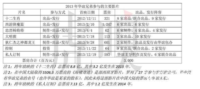 回过头来看,2013年竟然是华谊电影事业的巅峰。《2013年度报告》提到的影片有《十二生肖》、《西游降魔篇》、《大明猩》、《忠烈杨家将》、《海啸奇迹》、《控制》、《狄仁杰之神都龙王》、《私人订制》等8部。除《海啸奇迹》之外,7部影片总票房为31.2亿(数据来自《猫眼专业版》)。