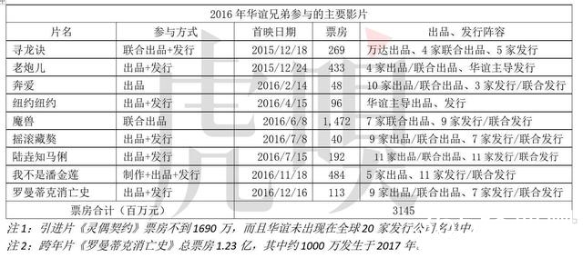 《2016年度报告》提到的影片有:《寻龙诀》、《老炮儿》、《纽约纽约》、《灵偶契约》、《奔爱》、《魔兽》、《摇滚藏獒》、《陆垚知马俐》、《我不是潘金莲》、《罗曼蒂克消亡史》等10部,总票房31亿。