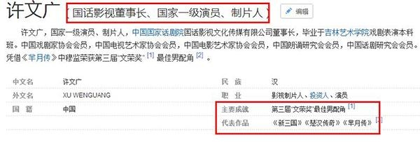 为此,小编度娘了一下——许文广,国家一级演员、制片人,中国国家话剧院国话影视文化传媒有限公司董事长,毕业于吉林艺术学院戏剧表演本科班。中国戏剧家协会会员,中国电视艺术家协会会员,中国电影艺术家协会会员,中国朗诵研究会会员,中国话剧研究会会员......牛X!
