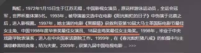 说完宁静再说说和她同一年出生的陶虹,现在的陶虹几乎淡出荧幕,提到陶虹大家可能最先想到的就是徐峥的老婆。可大家想不到的是,当年的陶虹凭借电影《黑眼睛》先是获得了国际电影节影后,那时才22岁,后来又凭借此片获得了金鸡奖和华表奖双料影后,当年的陶虹也就只有23岁而已。