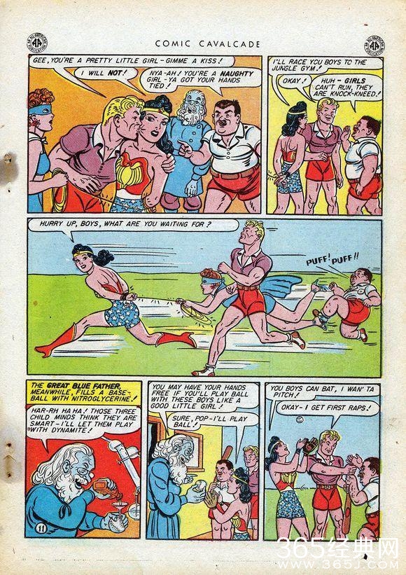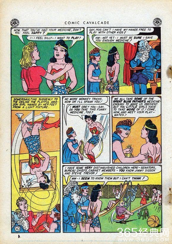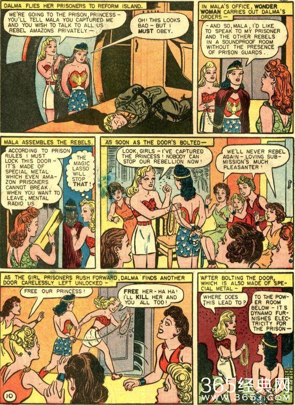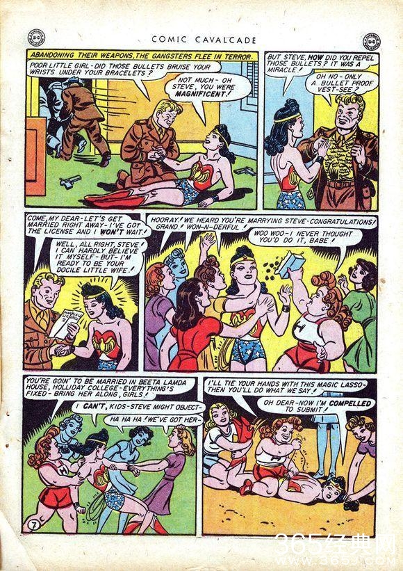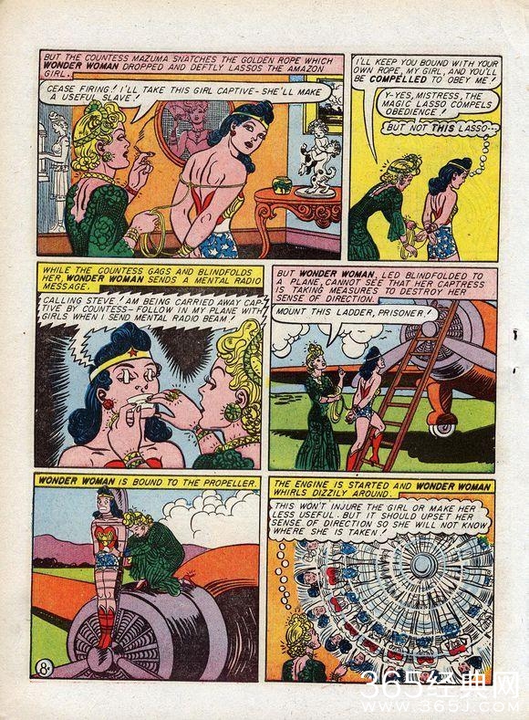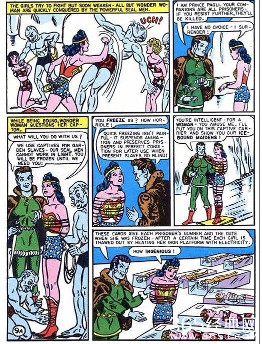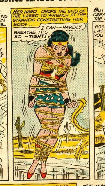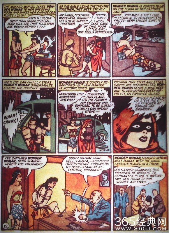 从神奇女郎早期画的漫画看出来,作者应该也是SM和紧缚爱好者,大量被抓,捆绑的情节,还有类似SM紧缚逃脱魔术,为了解救同伴已经挣脱开绳子制服了坏人,又故意让坏人再把自己捆起来好方便潜入,协助导演拍电影让演员捆自己等等段子,加上她还带着绳子,而且那绳子捆自己比捆坏人的次数和还多。。