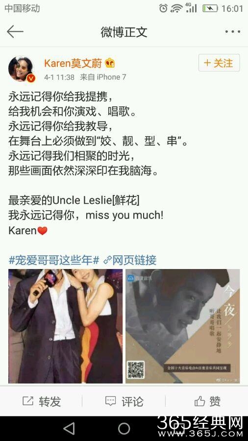 尹正是张国荣的迷弟,这是众所周知的,他发的文最暖心,还有汪涵,每年都不曾间断,被称为骨灰级荣迷,但是,最令我恍惚的还是小倩王祖贤发文怀念采臣张国荣。