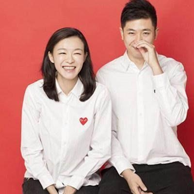 李艾与老公身着白衫黑裤,胸前的一颗“红心”也很吸引人,两个人都笑着,显得十分有爱。