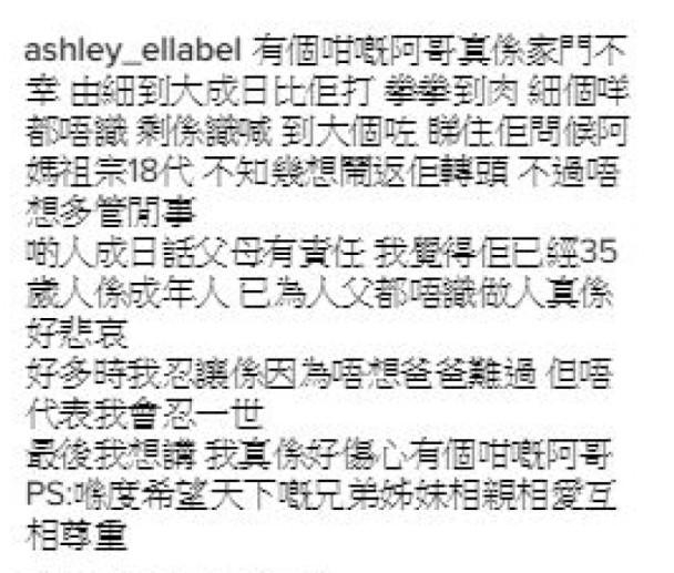 很多时候忍着哥哥是因为不想爸爸难过,哥哥如今都35岁了,但我忍一时不代表忍一世。并表示自己因为有这样的哥哥,真觉得好伤心。