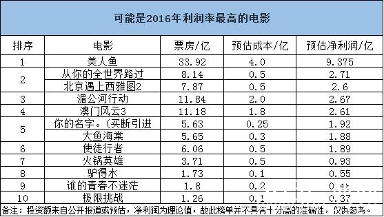 2016年全球最赚钱的10部电影完整名单近日终于出炉!据时光网报道,由照明娱乐打造的《爱宠大机密》以3.7465亿美元(折合人民币25.83亿元)的利润成为最赚钱影片。《死侍》以3.2224亿美元利润名列第二,《星球大战外传:侠盗一号》3.196亿美元名列第三。相比之下,2016年最赚钱的10部国产片利润差距明显。最赚钱的《美人鱼》比《爱宠大机密》少赚16亿!