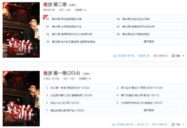 目前袁腾飞的节目《袁游》还在不断更新中,每期都有上百万的播放量。袁腾飞的微博也有近1500万的粉丝,可见文化名人在这个快餐时代非常吃香。