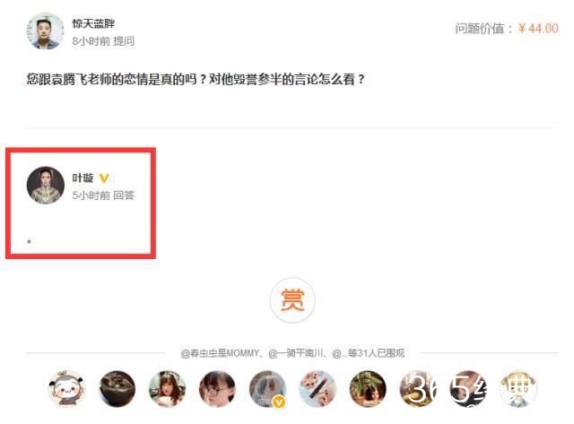 今天在微博问答中,叶璇回复了一个关于与袁腾飞恋情的问题。小编好不舍的花了1块钱围观,却换来的是叶璇的一个句号,真的好气哦。