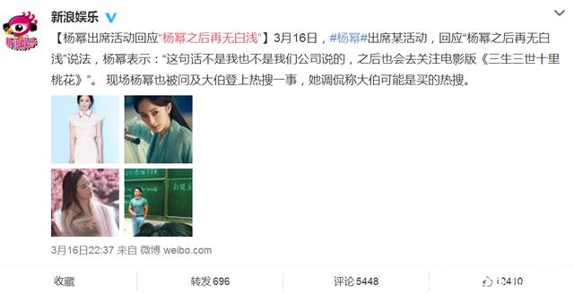前段时间《三生三世》非常火,然而到处都有“杨幂之后再无白浅”的说法,她表示这话不是自己说的,也不是公司说的,并且之后会关注电影版《三生三世》”。