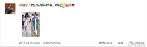 4月3日,邓超在微博晒出搞怪COS杨幂机场街拍的照片,遭杨幂回应“撞衫不可怕,谁丑谁尴尬。”4月5日,不服输的邓超再次上传新的COS照,配文:“我已经有新款咯,你呢?@杨幂 ”并在评论喊话:“服吗杨幂?”
