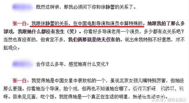张一白在采访里也掩饰不住对徐静蕾的赞许,并称自己和徐静蕾关系是“绝无仅有”的。