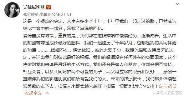 时隔近一周后,吴佳尼首次在微博回应离婚一事。理性的让人出奇,并用温暖的文字打脸了之前的家暴说。吴佳妮写道:这是一个艰难的决定。人生有多少个十年,十年里我们一起走过的路,已然成为彼此生命中的一部分,承载了满满的回忆。爱情里没有对错,重要的是,我们都在这段婚姻中慢慢经历、逐渐成长。生活中的甜酸苦辣是成长最好的肥料,我们一起经历了十年岁月,这都是我们共同体验的功课……婚姻不在,情谊依旧,彼此大爱于心,我能体悟和支持景涛的决定,并送出我们对彼此最好的祝福。我们的婚姻没有任何外在的负面因素,这个决定对我们来说是最好的生活方式,我们还会是家人和朋友,依然会相互扶持,相互关爱,以及共同呵护两个可爱的儿子,尽父母应尽的职责和义务……感谢一直陪伴我们的影迷朋友们和所有爱我们的人。未来的路还很长,我们都会继续坚强勇敢的走下去,相信未来都会越来越好!相信一切都是最好的安排!@马景涛”