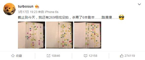 前段时间,孙俪发了一篇微博,配图几十本厚厚的剧本,上面贴满了五颜六色的标签,并配文“截止到今天,我还有269场戏没拍,杀青了6本剧本。”